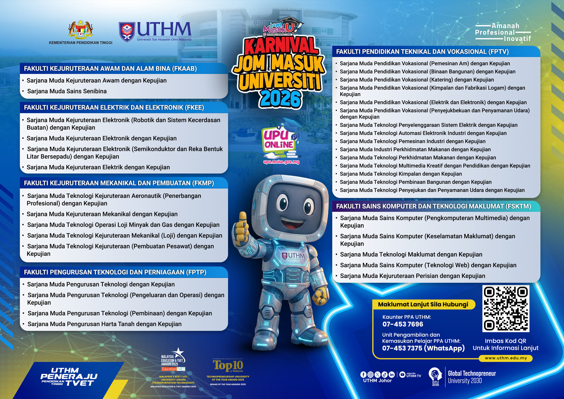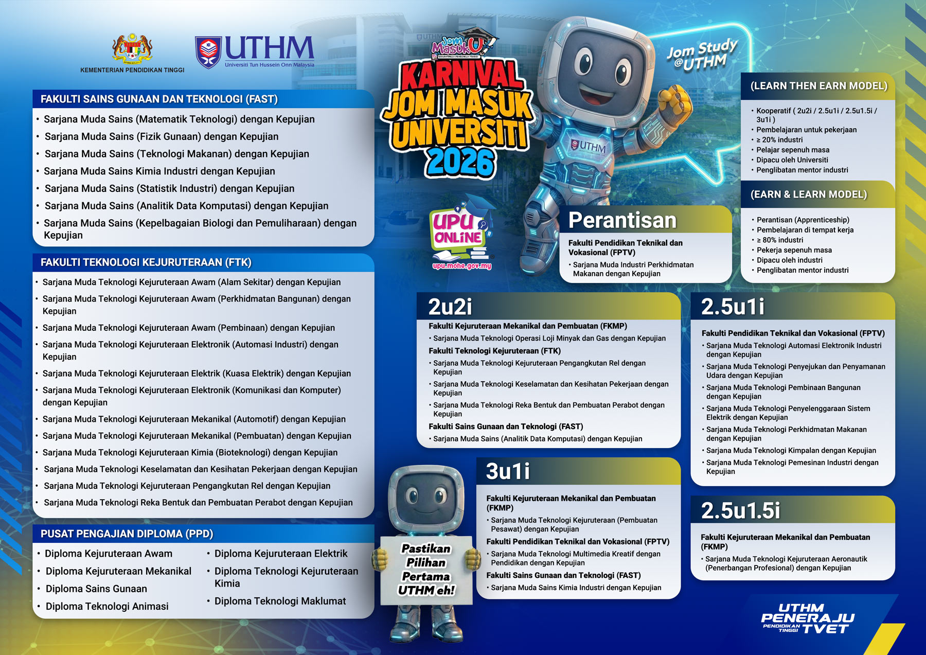 Permohonan ke UTHM menerusi UPU secara atas talian bagi Lepasan SPM / Diploma / Matrikulasi / STPM/ dan Setaraf Sesi Akademik 2026/2027 telah dibuka mulai 29 Januari 2026 sehingga 23 Mac 2026 jam 5.00 petang.